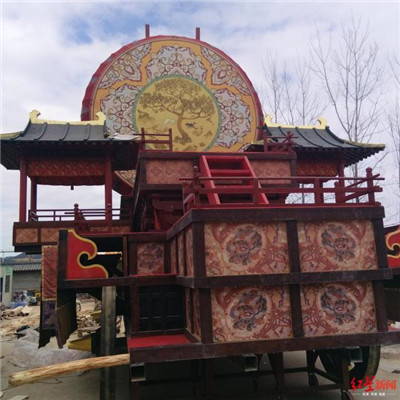 除了做彩燈外,宋建平所在的公司還負責了劇中拔車的制作。宋建平介紹,拔車類似木頭推車,巡游時可以放置彩燈,表演人員可以站在上面。在制作時,工人參考了古時戰(zhàn)車的圖片,并在拔車上安裝了一個木頭平臺方便站人和放置彩燈。整個拔車制作過程并不復雜,只是劇組要求做舊。為此,制作時的所有木料都用火燒了一遍,再打磨、暴曬兩到三周。